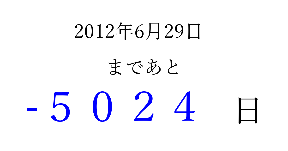2012年6月29日(金)は もう 0000 日過ぎました 追加すると、トップページからすぐ選べるようになります ※2026/04/01現在の結果です。 最新の状態に更新する ↓シェアして、タイムライン上にカウントダウンを表示しよう!↓ 📤 この結果を共有する Tweet シェア Threads Bluesky 別の日付でカウントダウン 2012年6月のカレンダー このページをブックマークに追加すると、いつでもカウントダウンを確認できます。 (PC: Ctrl+D / Mac: ⌘+D) hitome-notes.comでは以下のページも運営しています。 指定日と期間から日付を計算 | ガチャ確率計算・シミュレーション | プライバシー・ポリシー 運営者:Avocado
