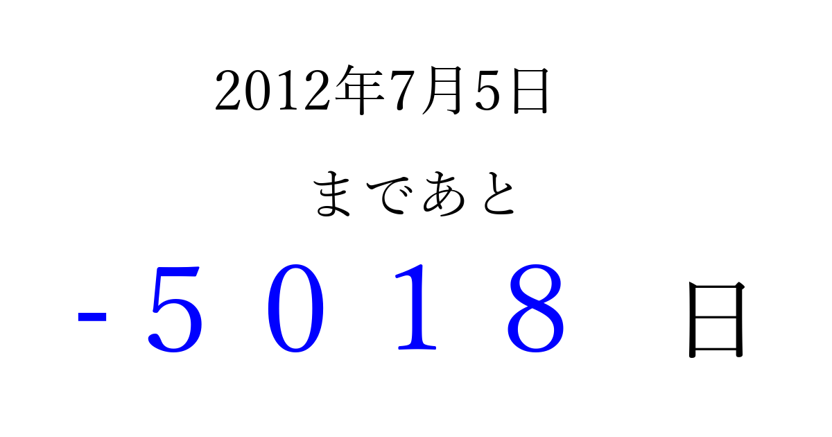 2012年7月5日(木)は もう 0000 日過ぎました 追加すると、トップページからすぐ選べるようになります ※2026/04/01現在の結果です。 最新の状態に更新する ↓シェアして、タイムライン上にカウントダウンを表示しよう!↓ 📤 この結果を共有する Tweet シェア Threads Bluesky 別の日付でカウントダウン 2012年7月のカレンダー このページをブックマークに追加すると、いつでもカウントダウンを確認できます。 (PC: Ctrl+D / Mac: ⌘+D) hitome-notes.comでは以下のページも運営しています。 指定日と期間から日付を計算 | ガチャ確率計算・シミュレーション | プライバシー・ポリシー 運営者:Avocado