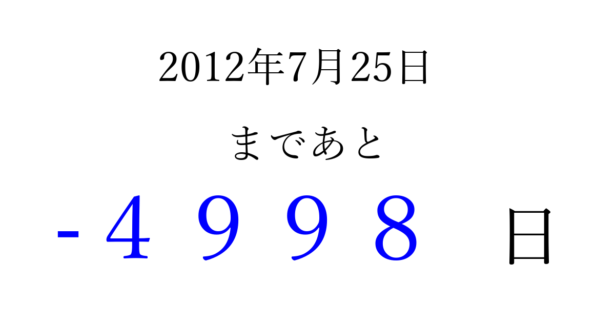 2012年7月25日(水)は もう 0000 日過ぎました 追加すると、トップページからすぐ選べるようになります ※2026/04/01現在の結果です。 最新の状態に更新する ↓シェアして、タイムライン上にカウントダウンを表示しよう!↓ 📤 この結果を共有する Tweet シェア Threads Bluesky 別の日付でカウントダウン 2012年7月のカレンダー このページをブックマークに追加すると、いつでもカウントダウンを確認できます。 (PC: Ctrl+D / Mac: ⌘+D) hitome-notes.comでは以下のページも運営しています。 指定日と期間から日付を計算 | ガチャ確率計算・シミュレーション | プライバシー・ポリシー 運営者:Avocado