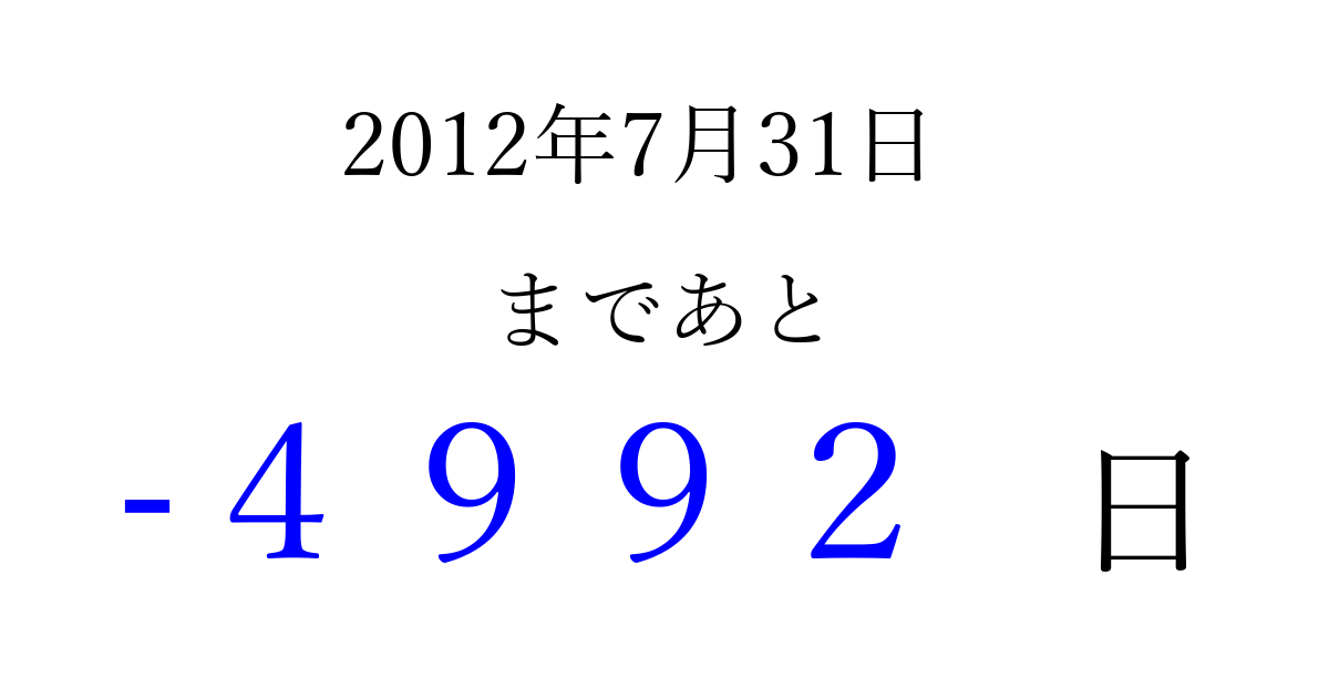 2012年7月31日(火)は もう 0000 日過ぎました 追加すると、トップページからすぐ選べるようになります ※2026/04/01現在の結果です。 最新の状態に更新する ↓シェアして、タイムライン上にカウントダウンを表示しよう!↓ 📤 この結果を共有する Tweet シェア Threads Bluesky 別の日付でカウントダウン 2012年7月のカレンダー このページをブックマークに追加すると、いつでもカウントダウンを確認できます。 (PC: Ctrl+D / Mac: ⌘+D) hitome-notes.comでは以下のページも運営しています。 指定日と期間から日付を計算 | ガチャ確率計算・シミュレーション | プライバシー・ポリシー 運営者:Avocado