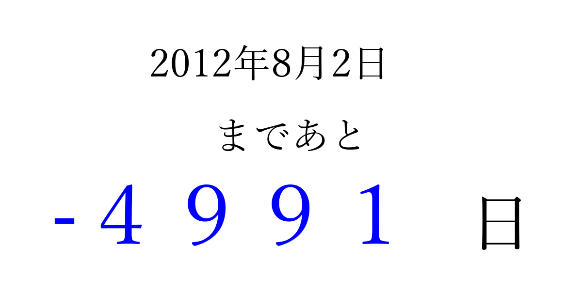 2012年8月2日(木)は もう 0000 日過ぎました 追加すると、トップページからすぐ選べるようになります ※2026/04/02現在の結果です。 最新の状態に更新する ↓シェアして、タイムライン上にカウントダウンを表示しよう!↓ 📤 この結果を共有する Tweet シェア Threads Bluesky 別の日付でカウントダウン 2012年8月のカレンダー このページをブックマークに追加すると、いつでもカウントダウンを確認できます。 (PC: Ctrl+D / Mac: ⌘+D) hitome-notes.comでは以下のページも運営しています。 指定日と期間から日付を計算 | ガチャ確率計算・シミュレーション | プライバシー・ポリシー 運営者:Avocado