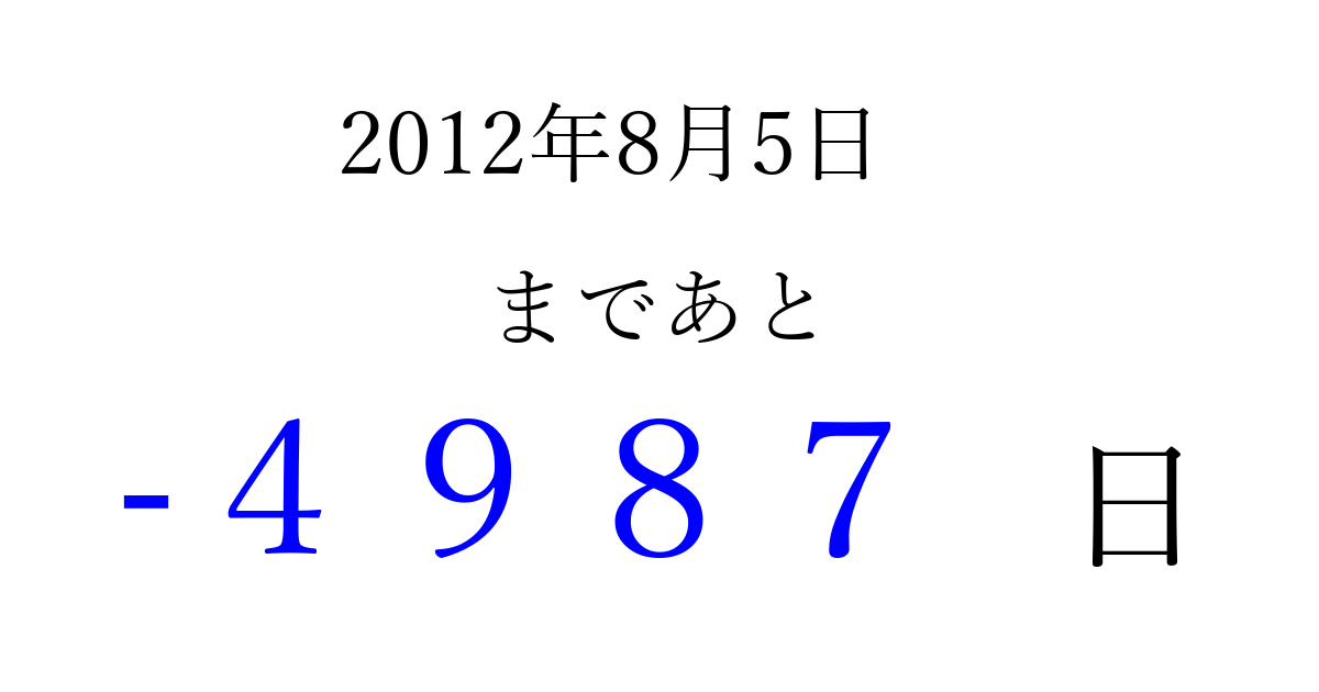 2012年8月5日(日)は もう 0000 日過ぎました 追加すると、トップページからすぐ選べるようになります ※2026/04/01現在の結果です。 最新の状態に更新する ↓シェアして、タイムライン上にカウントダウンを表示しよう!↓ 📤 この結果を共有する Tweet シェア Threads Bluesky 別の日付でカウントダウン 2012年8月のカレンダー このページをブックマークに追加すると、いつでもカウントダウンを確認できます。 (PC: Ctrl+D / Mac: ⌘+D) hitome-notes.comでは以下のページも運営しています。 指定日と期間から日付を計算 | ガチャ確率計算・シミュレーション | プライバシー・ポリシー 運営者:Avocado