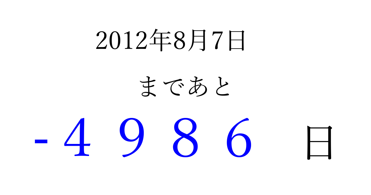 2012年8月7日(火)は もう 0000 日過ぎました 追加すると、トップページからすぐ選べるようになります ※2026/04/02現在の結果です。 最新の状態に更新する ↓シェアして、タイムライン上にカウントダウンを表示しよう!↓ 📤 この結果を共有する Tweet シェア Threads Bluesky 別の日付でカウントダウン 2012年8月のカレンダー このページをブックマークに追加すると、いつでもカウントダウンを確認できます。 (PC: Ctrl+D / Mac: ⌘+D) hitome-notes.comでは以下のページも運営しています。 指定日と期間から日付を計算 | ガチャ確率計算・シミュレーション | プライバシー・ポリシー 運営者:Avocado