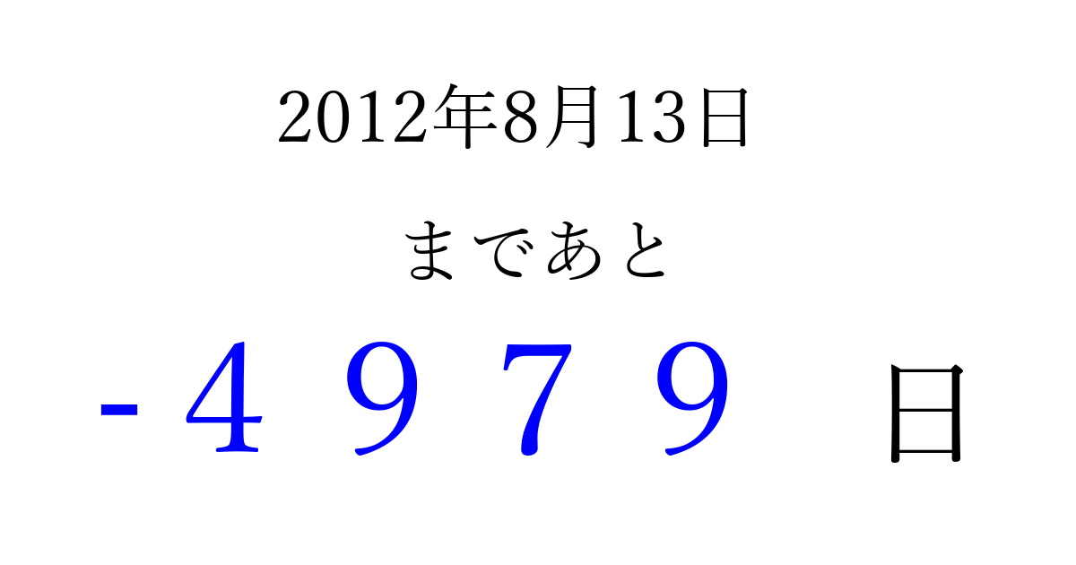 2012年8月13日(月)は もう 0000 日過ぎました 追加すると、トップページからすぐ選べるようになります ※2026/04/01現在の結果です。 最新の状態に更新する ↓シェアして、タイムライン上にカウントダウンを表示しよう!↓ 📤 この結果を共有する Tweet シェア Threads Bluesky 別の日付でカウントダウン 2012年8月のカレンダー このページをブックマークに追加すると、いつでもカウントダウンを確認できます。 (PC: Ctrl+D / Mac: ⌘+D) hitome-notes.comでは以下のページも運営しています。 指定日と期間から日付を計算 | ガチャ確率計算・シミュレーション | プライバシー・ポリシー 運営者:Avocado