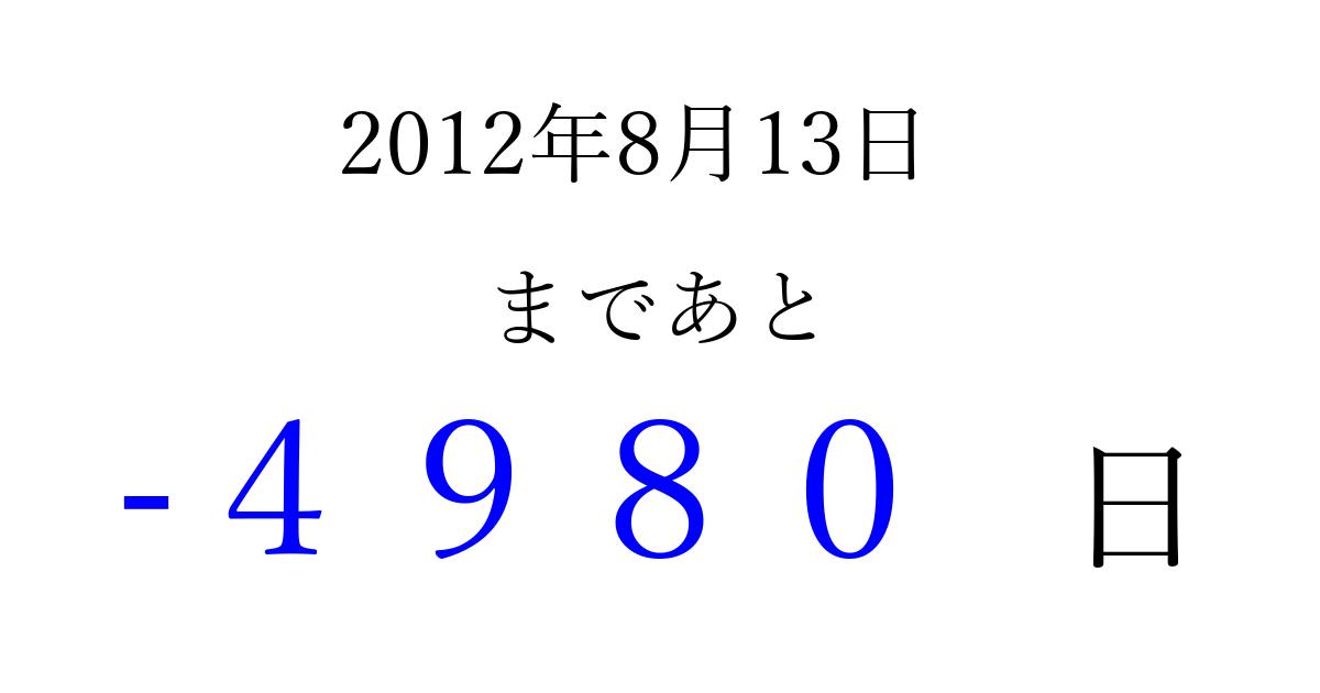 2012年8月13日(月)は もう 0000 日過ぎました 追加すると、トップページからすぐ選べるようになります ※2026/04/02現在の結果です。 最新の状態に更新する ↓シェアして、タイムライン上にカウントダウンを表示しよう!↓ 📤 この結果を共有する Tweet シェア Threads Bluesky 別の日付でカウントダウン 2012年8月のカレンダー このページをブックマークに追加すると、いつでもカウントダウンを確認できます。 (PC: Ctrl+D / Mac: ⌘+D) hitome-notes.comでは以下のページも運営しています。 指定日と期間から日付を計算 | ガチャ確率計算・シミュレーション | プライバシー・ポリシー 運営者:Avocado
