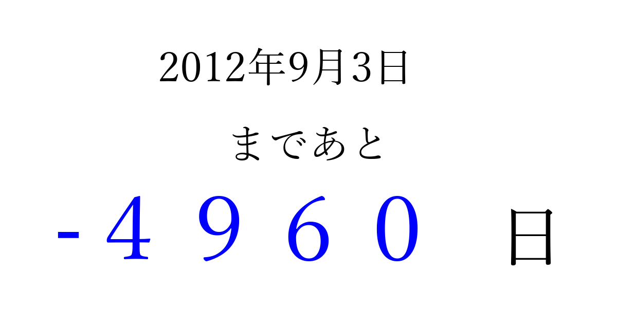 2012年9月3日(月)は もう 0000 日過ぎました 追加すると、トップページからすぐ選べるようになります ※2026/04/03現在の結果です。 最新の状態に更新する ↓シェアして、タイムライン上にカウントダウンを表示しよう!↓ 📤 この結果を共有する Tweet シェア Threads Bluesky 別の日付でカウントダウン 2012年9月のカレンダー このページをブックマークに追加すると、いつでもカウントダウンを確認できます。 (PC: Ctrl+D / Mac: ⌘+D) hitome-notes.comでは以下のページも運営しています。 指定日と期間から日付を計算 | ガチャ確率計算・シミュレーション | プライバシー・ポリシー 運営者:Avocado