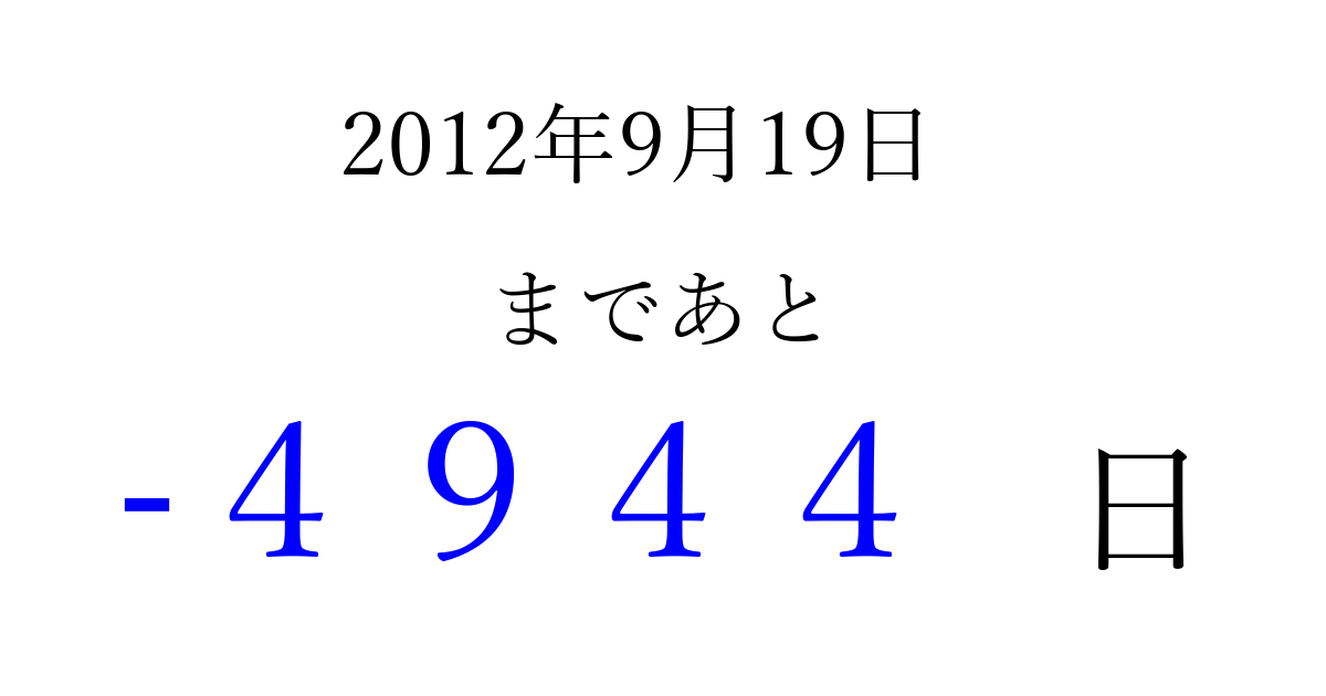 2012年9月19日(水)は もう 0000 日過ぎました 追加すると、トップページからすぐ選べるようになります ※2026/04/03現在の結果です。 最新の状態に更新する ↓シェアして、タイムライン上にカウントダウンを表示しよう!↓ 📤 この結果を共有する Tweet シェア Threads Bluesky 別の日付でカウントダウン 2012年9月のカレンダー このページをブックマークに追加すると、いつでもカウントダウンを確認できます。 (PC: Ctrl+D / Mac: ⌘+D) hitome-notes.comでは以下のページも運営しています。 指定日と期間から日付を計算 | ガチャ確率計算・シミュレーション | プライバシー・ポリシー 運営者:Avocado