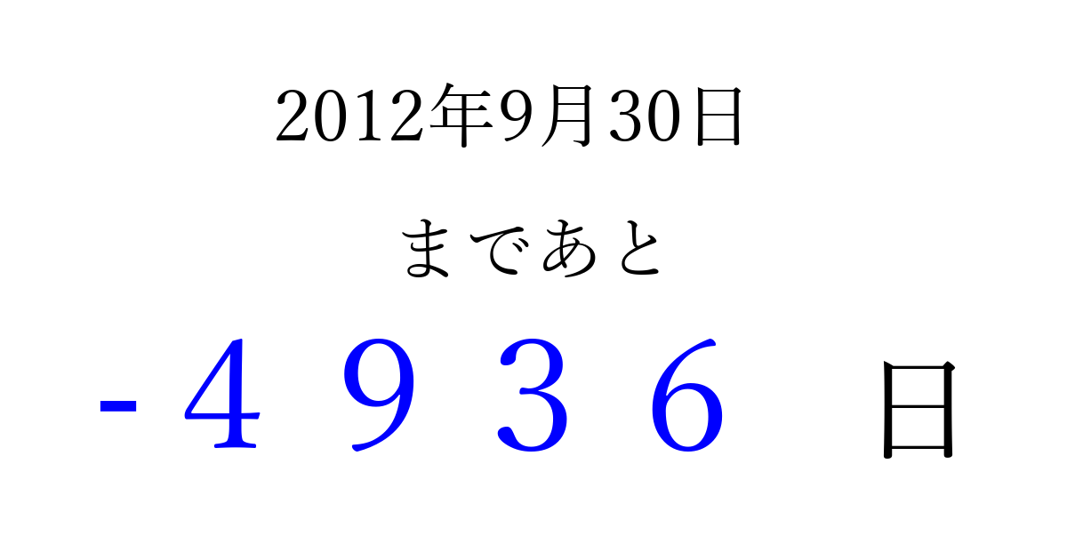 2012年9月30日(日)は もう 0000 日過ぎました 追加すると、トップページからすぐ選べるようになります ※2026/04/06現在の結果です。 最新の状態に更新する ↓シェアして、タイムライン上にカウントダウンを表示しよう!↓ 📤 この結果を共有する Tweet シェア Threads Bluesky 別の日付でカウントダウン 2012年9月のカレンダー このページをブックマークに追加すると、いつでもカウントダウンを確認できます。 (PC: Ctrl+D / Mac: ⌘+D) hitome-notes.comでは以下のページも運営しています。 指定日と期間から日付を計算 | ガチャ確率計算・シミュレーション | プライバシー・ポリシー 運営者:Avocado