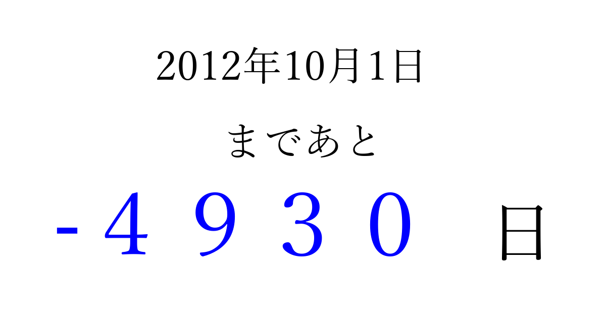 2012年10月1日(月)は もう 0000 日過ぎました 追加すると、トップページからすぐ選べるようになります ※2026/04/01現在の結果です。 最新の状態に更新する ↓シェアして、タイムライン上にカウントダウンを表示しよう!↓ 📤 この結果を共有する Tweet シェア Threads Bluesky 別の日付でカウントダウン 2012年10月のカレンダー このページをブックマークに追加すると、いつでもカウントダウンを確認できます。 (PC: Ctrl+D / Mac: ⌘+D) hitome-notes.comでは以下のページも運営しています。 指定日と期間から日付を計算 | ガチャ確率計算・シミュレーション | プライバシー・ポリシー 運営者:Avocado