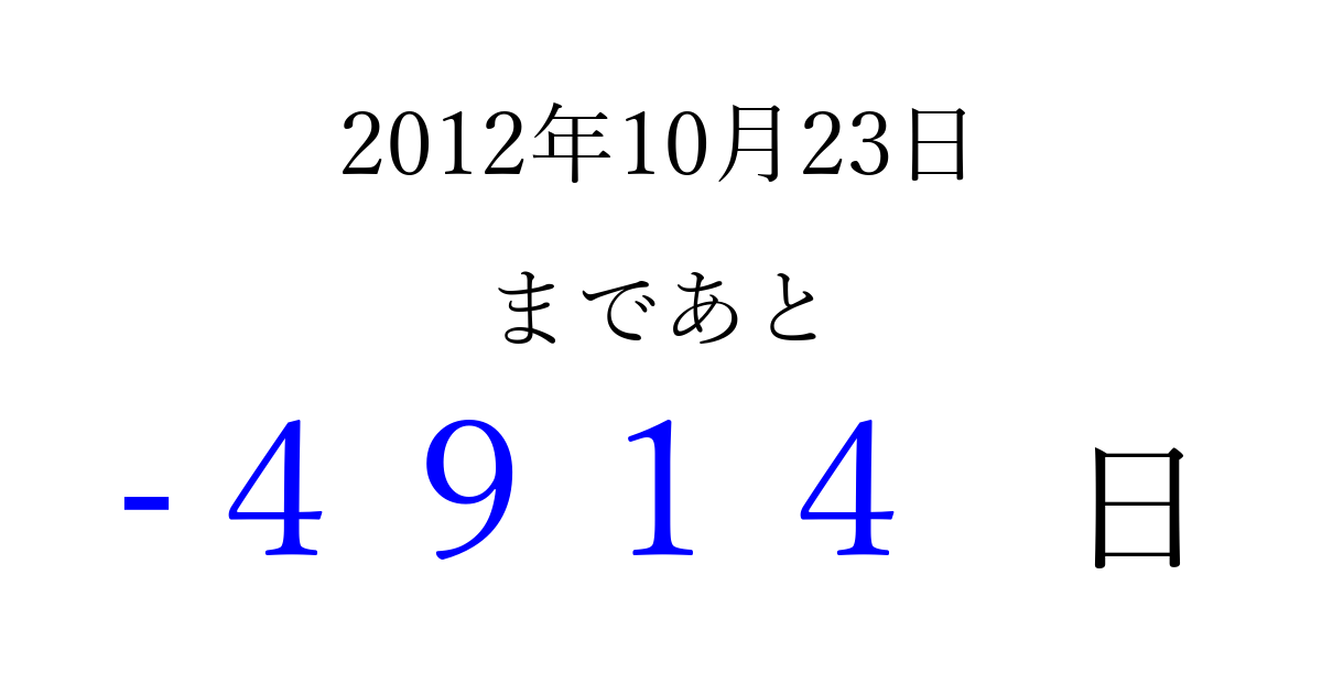 2012年10月23日(火)は もう 0000 日過ぎました 追加すると、トップページからすぐ選べるようになります ※2026/04/07現在の結果です。 最新の状態に更新する ↓シェアして、タイムライン上にカウントダウンを表示しよう!↓ 📤 この結果を共有する Tweet シェア Threads Bluesky 別の日付でカウントダウン 2012年10月のカレンダー このページをブックマークに追加すると、いつでもカウントダウンを確認できます。 (PC: Ctrl+D / Mac: ⌘+D) hitome-notes.comでは以下のページも運営しています。 指定日と期間から日付を計算 | ガチャ確率計算・シミュレーション | プライバシー・ポリシー 運営者:Avocado