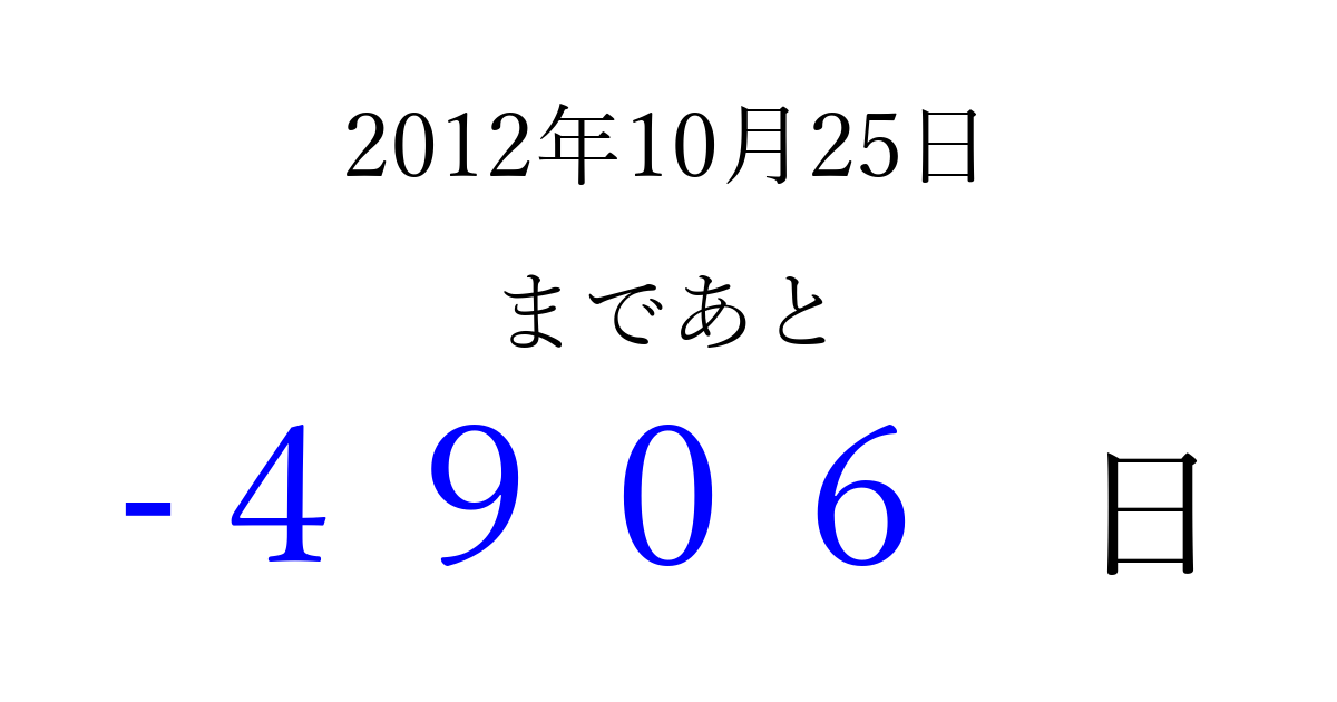 2012年10月25日(木)は もう 0000 日過ぎました 追加すると、トップページからすぐ選べるようになります ※2026/04/01現在の結果です。 最新の状態に更新する ↓シェアして、タイムライン上にカウントダウンを表示しよう!↓ 📤 この結果を共有する Tweet シェア Threads Bluesky 別の日付でカウントダウン 2012年10月のカレンダー このページをブックマークに追加すると、いつでもカウントダウンを確認できます。 (PC: Ctrl+D / Mac: ⌘+D) hitome-notes.comでは以下のページも運営しています。 指定日と期間から日付を計算 | ガチャ確率計算・シミュレーション | プライバシー・ポリシー 運営者:Avocado