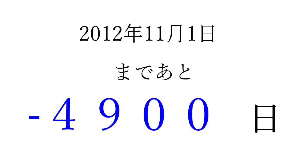 2012年11月1日(木)は もう 0000 日過ぎました 追加すると、トップページからすぐ選べるようになります ※2026/04/02現在の結果です。 最新の状態に更新する ↓シェアして、タイムライン上にカウントダウンを表示しよう!↓ 📤 この結果を共有する Tweet シェア Threads Bluesky 別の日付でカウントダウン 2012年11月のカレンダー このページをブックマークに追加すると、いつでもカウントダウンを確認できます。 (PC: Ctrl+D / Mac: ⌘+D) hitome-notes.comでは以下のページも運営しています。 指定日と期間から日付を計算 | ガチャ確率計算・シミュレーション | プライバシー・ポリシー 運営者:Avocado