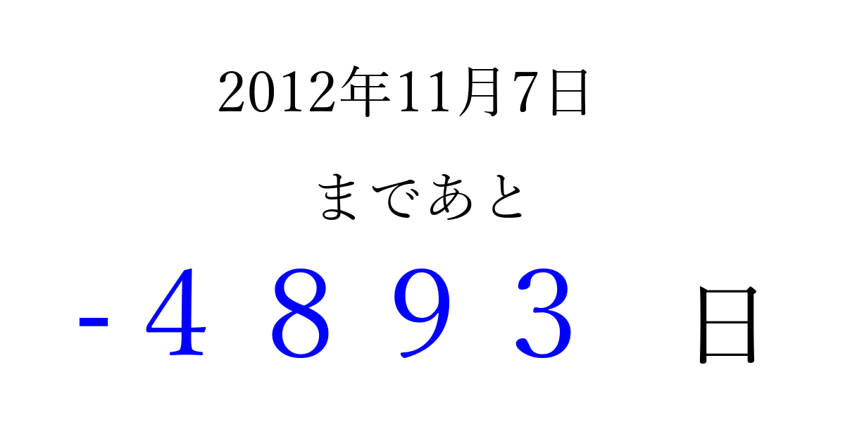 2012年11月7日(水)は もう 0000 日過ぎました 追加すると、トップページからすぐ選べるようになります ※2026/04/01現在の結果です。 最新の状態に更新する ↓シェアして、タイムライン上にカウントダウンを表示しよう!↓ 📤 この結果を共有する Tweet シェア Threads Bluesky 別の日付でカウントダウン 2012年11月のカレンダー このページをブックマークに追加すると、いつでもカウントダウンを確認できます。 (PC: Ctrl+D / Mac: ⌘+D) hitome-notes.comでは以下のページも運営しています。 指定日と期間から日付を計算 | ガチャ確率計算・シミュレーション | プライバシー・ポリシー 運営者:Avocado