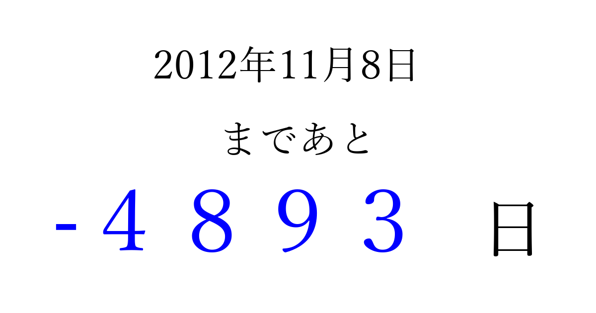 2012年11月8日(木)は もう 0000 日過ぎました 追加すると、トップページからすぐ選べるようになります ※2026/04/02現在の結果です。 最新の状態に更新する ↓シェアして、タイムライン上にカウントダウンを表示しよう!↓ 📤 この結果を共有する Tweet シェア Threads Bluesky 別の日付でカウントダウン 2012年11月のカレンダー このページをブックマークに追加すると、いつでもカウントダウンを確認できます。 (PC: Ctrl+D / Mac: ⌘+D) hitome-notes.comでは以下のページも運営しています。 指定日と期間から日付を計算 | ガチャ確率計算・シミュレーション | プライバシー・ポリシー 運営者:Avocado