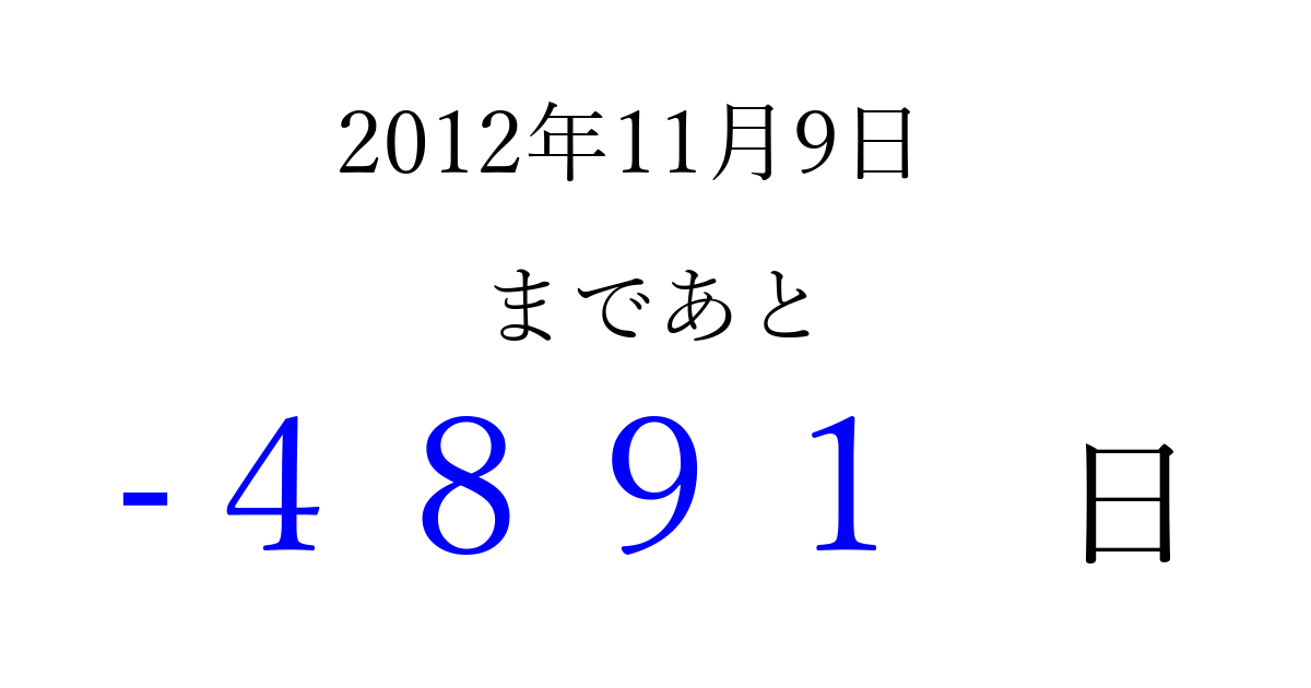 2012年11月9日(金)は もう 0000 日過ぎました 追加すると、トップページからすぐ選べるようになります ※2026/04/01現在の結果です。 最新の状態に更新する ↓シェアして、タイムライン上にカウントダウンを表示しよう!↓ 📤 この結果を共有する Tweet シェア Threads Bluesky 別の日付でカウントダウン 2012年11月のカレンダー このページをブックマークに追加すると、いつでもカウントダウンを確認できます。 (PC: Ctrl+D / Mac: ⌘+D) hitome-notes.comでは以下のページも運営しています。 指定日と期間から日付を計算 | ガチャ確率計算・シミュレーション | プライバシー・ポリシー 運営者:Avocado