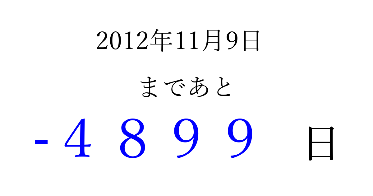 2012年11月9日(金)は もう 0000 日過ぎました 追加すると、トップページからすぐ選べるようになります ※2026/04/09現在の結果です。 最新の状態に更新する ↓シェアして、タイムライン上にカウントダウンを表示しよう!↓ 📤 この結果を共有する Tweet シェア Threads Bluesky 別の日付でカウントダウン 2012年11月のカレンダー このページをブックマークに追加すると、いつでもカウントダウンを確認できます。 (PC: Ctrl+D / Mac: ⌘+D) hitome-notes.comでは以下のページも運営しています。 指定日と期間から日付を計算 | ガチャ確率計算・シミュレーション | プライバシー・ポリシー 運営者:Avocado