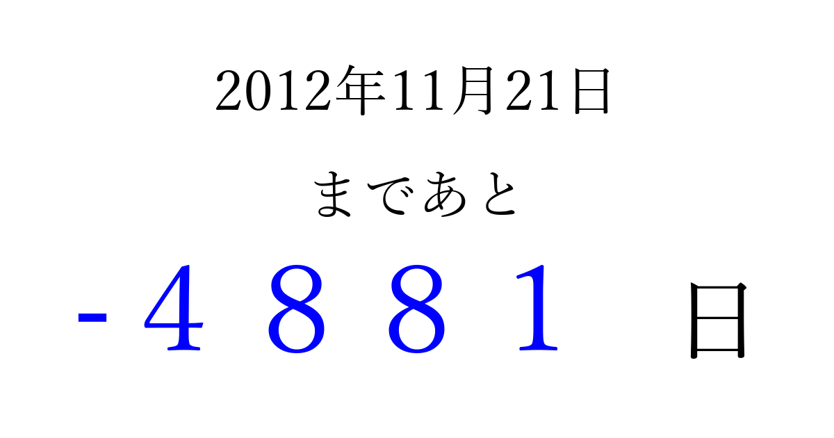 2012年11月21日(水)は もう 0000 日過ぎました 追加すると、トップページからすぐ選べるようになります ※2026/04/03現在の結果です。 最新の状態に更新する ↓シェアして、タイムライン上にカウントダウンを表示しよう!↓ 📤 この結果を共有する Tweet シェア Threads Bluesky 別の日付でカウントダウン 2012年11月のカレンダー このページをブックマークに追加すると、いつでもカウントダウンを確認できます。 (PC: Ctrl+D / Mac: ⌘+D) hitome-notes.comでは以下のページも運営しています。 指定日と期間から日付を計算 | ガチャ確率計算・シミュレーション | プライバシー・ポリシー 運営者:Avocado