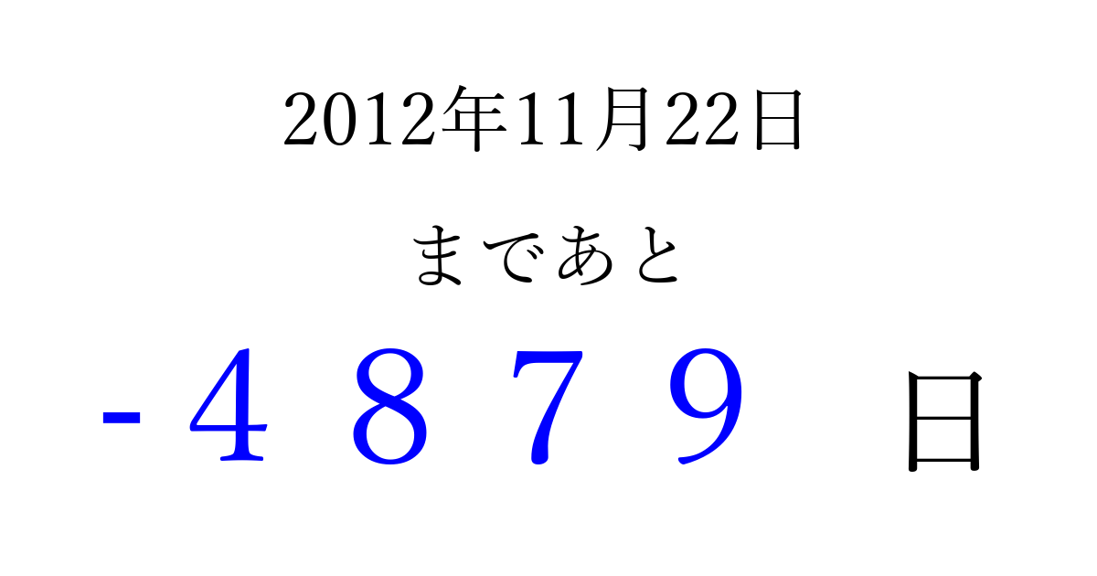 2012年11月22日(木)は もう 0000 日過ぎました 追加すると、トップページからすぐ選べるようになります ※2026/04/02現在の結果です。 最新の状態に更新する ↓シェアして、タイムライン上にカウントダウンを表示しよう!↓ 📤 この結果を共有する Tweet シェア Threads Bluesky 別の日付でカウントダウン 2012年11月のカレンダー このページをブックマークに追加すると、いつでもカウントダウンを確認できます。 (PC: Ctrl+D / Mac: ⌘+D) hitome-notes.comでは以下のページも運営しています。 指定日と期間から日付を計算 | ガチャ確率計算・シミュレーション | プライバシー・ポリシー 運営者:Avocado