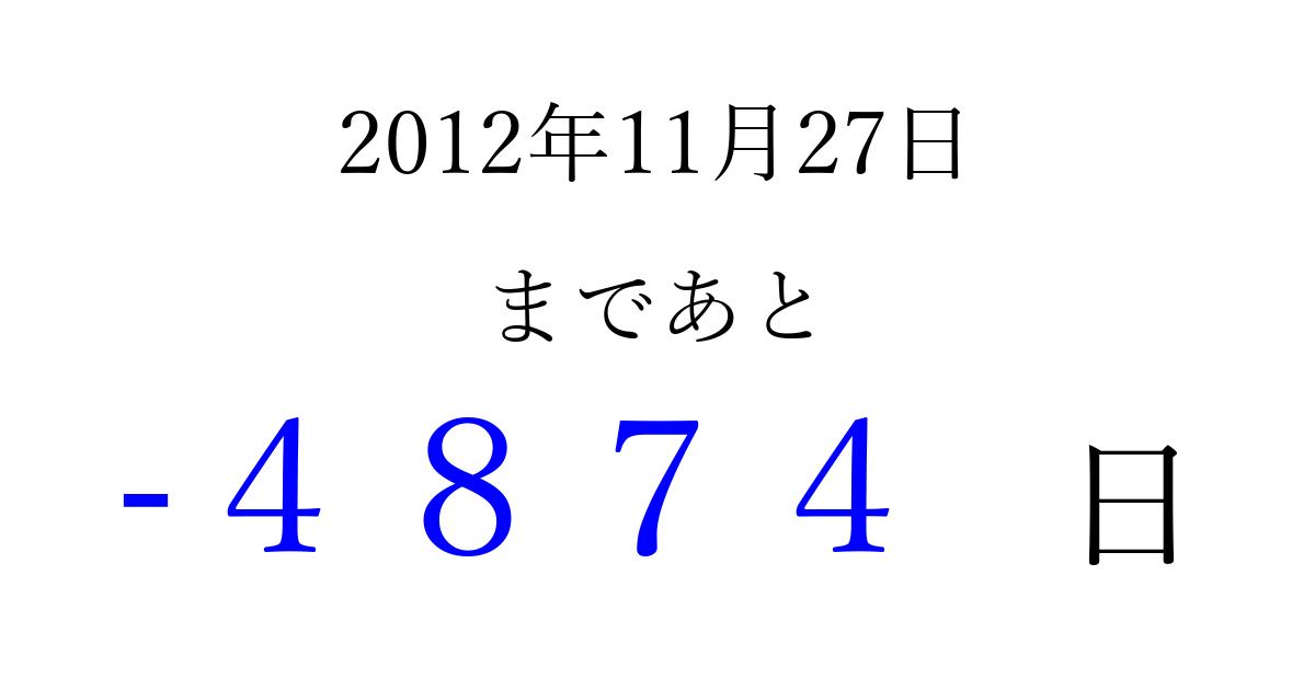 2012年11月27日(火)は もう 0000 日過ぎました 追加すると、トップページからすぐ選べるようになります ※2026/04/02現在の結果です。 最新の状態に更新する ↓シェアして、タイムライン上にカウントダウンを表示しよう!↓ 📤 この結果を共有する Tweet シェア Threads Bluesky 別の日付でカウントダウン 2012年11月のカレンダー このページをブックマークに追加すると、いつでもカウントダウンを確認できます。 (PC: Ctrl+D / Mac: ⌘+D) hitome-notes.comでは以下のページも運営しています。 指定日と期間から日付を計算 | ガチャ確率計算・シミュレーション | プライバシー・ポリシー 運営者:Avocado