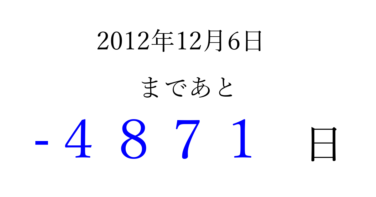 2012年12月6日(木)は もう 0000 日過ぎました 追加すると、トップページからすぐ選べるようになります ※2026/04/08現在の結果です。 最新の状態に更新する ↓シェアして、タイムライン上にカウントダウンを表示しよう!↓ 📤 この結果を共有する Tweet シェア Threads Bluesky 別の日付でカウントダウン 2012年12月のカレンダー このページをブックマークに追加すると、いつでもカウントダウンを確認できます。 (PC: Ctrl+D / Mac: ⌘+D) hitome-notes.comでは以下のページも運営しています。 指定日と期間から日付を計算 | ガチャ確率計算・シミュレーション | プライバシー・ポリシー 運営者:Avocado