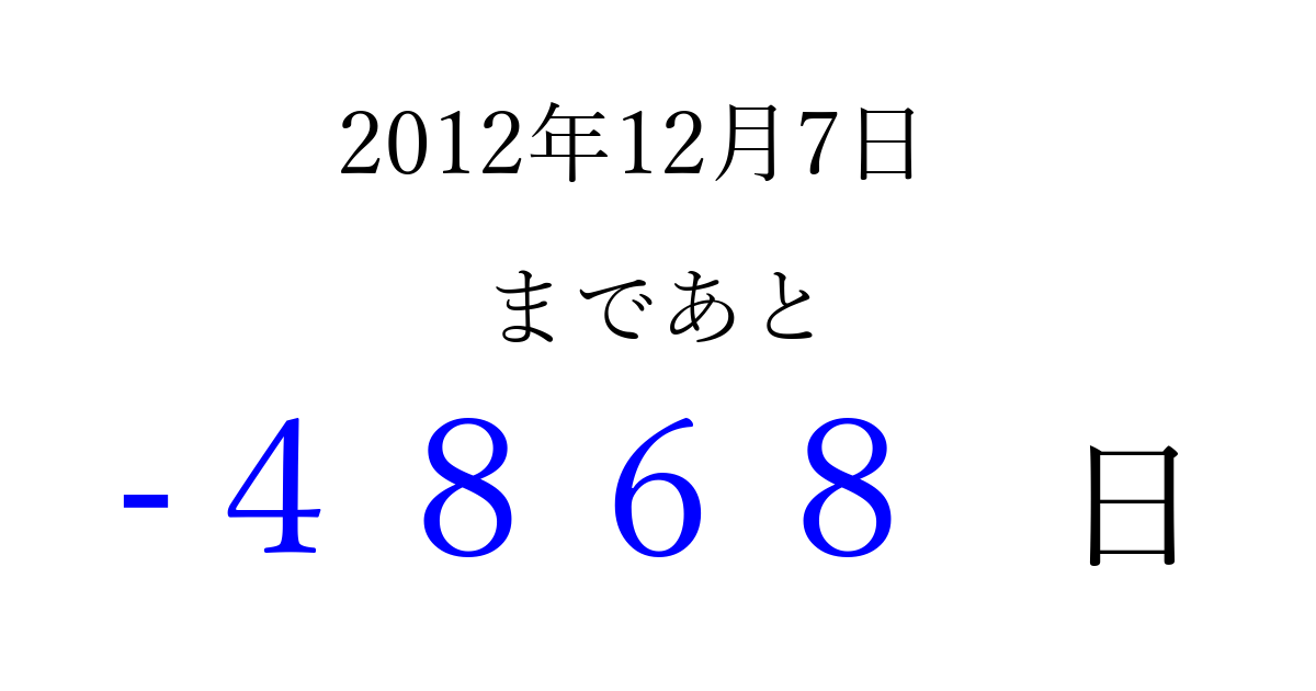 2012年12月7日(金)は もう 0000 日過ぎました 追加すると、トップページからすぐ選べるようになります ※2026/04/06現在の結果です。 最新の状態に更新する ↓シェアして、タイムライン上にカウントダウンを表示しよう!↓ 📤 この結果を共有する Tweet シェア Threads Bluesky 別の日付でカウントダウン 2012年12月のカレンダー このページをブックマークに追加すると、いつでもカウントダウンを確認できます。 (PC: Ctrl+D / Mac: ⌘+D) hitome-notes.comでは以下のページも運営しています。 指定日と期間から日付を計算 | ガチャ確率計算・シミュレーション | プライバシー・ポリシー 運営者:Avocado