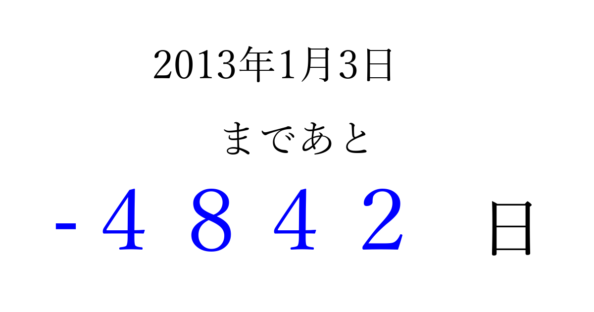 2013年1月3日(木)は もう 0000 日過ぎました 追加すると、トップページからすぐ選べるようになります ※2026/04/07現在の結果です。 最新の状態に更新する ↓シェアして、タイムライン上にカウントダウンを表示しよう!↓ 📤 この結果を共有する Tweet シェア Threads Bluesky 別の日付でカウントダウン 2013年1月のカレンダー このページをブックマークに追加すると、いつでもカウントダウンを確認できます。 (PC: Ctrl+D / Mac: ⌘+D) hitome-notes.comでは以下のページも運営しています。 指定日と期間から日付を計算 | ガチャ確率計算・シミュレーション | プライバシー・ポリシー 運営者:Avocado
