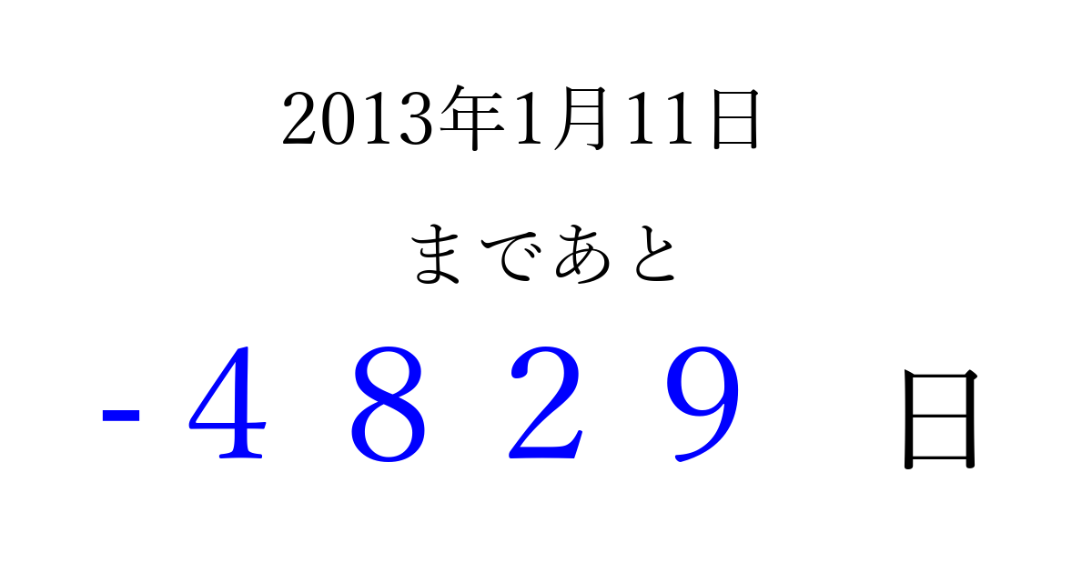 2013年1月11日(金)は もう 0000 日過ぎました 追加すると、トップページからすぐ選べるようになります ※2026/04/02現在の結果です。 最新の状態に更新する ↓シェアして、タイムライン上にカウントダウンを表示しよう!↓ 📤 この結果を共有する Tweet シェア Threads Bluesky 別の日付でカウントダウン 2013年1月のカレンダー このページをブックマークに追加すると、いつでもカウントダウンを確認できます。 (PC: Ctrl+D / Mac: ⌘+D) hitome-notes.comでは以下のページも運営しています。 指定日と期間から日付を計算 | ガチャ確率計算・シミュレーション | プライバシー・ポリシー 運営者:Avocado