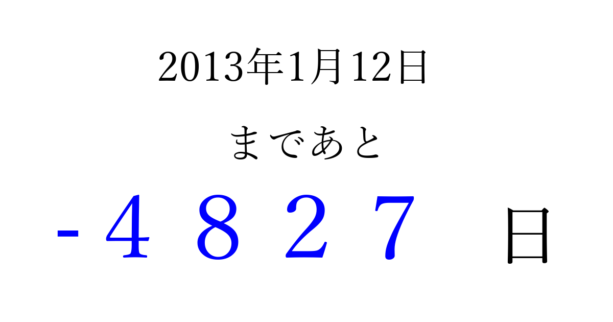 2013年1月12日(土)は もう 0000 日過ぎました 追加すると、トップページからすぐ選べるようになります ※2026/04/01現在の結果です。 最新の状態に更新する ↓シェアして、タイムライン上にカウントダウンを表示しよう!↓ 📤 この結果を共有する Tweet シェア Threads Bluesky 別の日付でカウントダウン 2013年1月のカレンダー このページをブックマークに追加すると、いつでもカウントダウンを確認できます。 (PC: Ctrl+D / Mac: ⌘+D) hitome-notes.comでは以下のページも運営しています。 指定日と期間から日付を計算 | ガチャ確率計算・シミュレーション | プライバシー・ポリシー 運営者:Avocado
