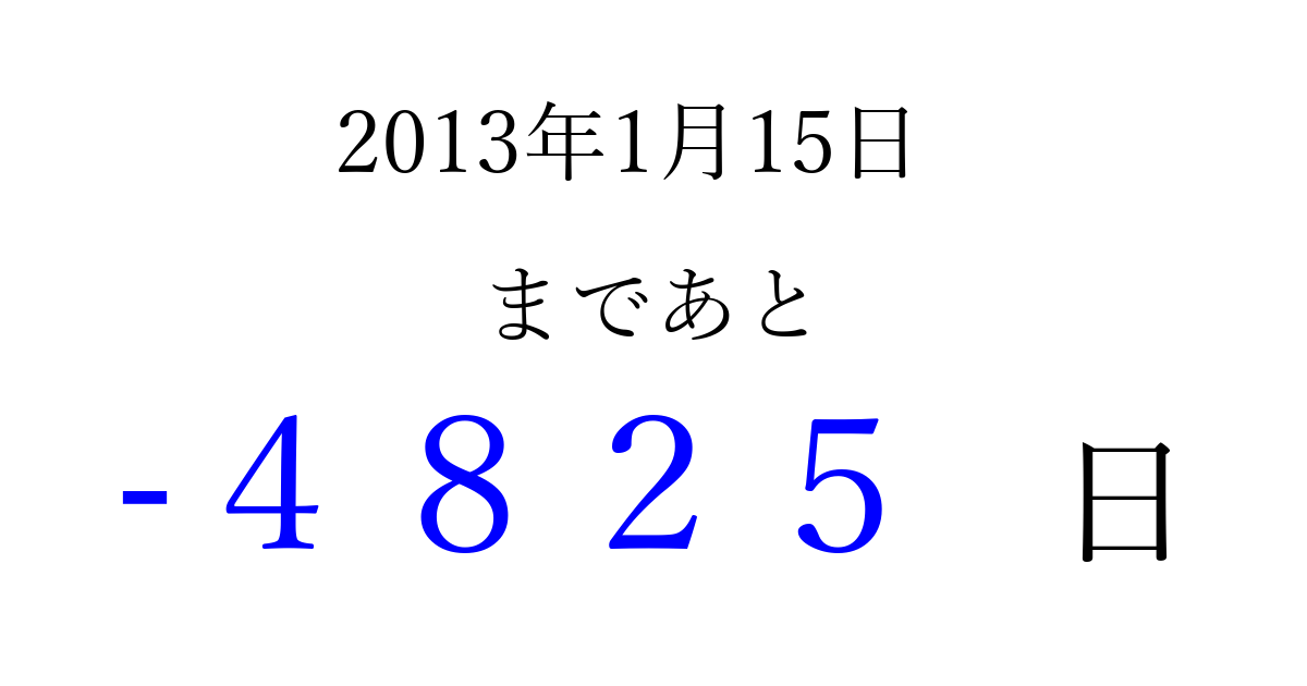 2013年1月15日(火)は もう 0000 日過ぎました 追加すると、トップページからすぐ選べるようになります ※2026/04/02現在の結果です。 最新の状態に更新する ↓シェアして、タイムライン上にカウントダウンを表示しよう!↓ 📤 この結果を共有する Tweet シェア Threads Bluesky 別の日付でカウントダウン 2013年1月のカレンダー このページをブックマークに追加すると、いつでもカウントダウンを確認できます。 (PC: Ctrl+D / Mac: ⌘+D) hitome-notes.comでは以下のページも運営しています。 指定日と期間から日付を計算 | ガチャ確率計算・シミュレーション | プライバシー・ポリシー 運営者:Avocado