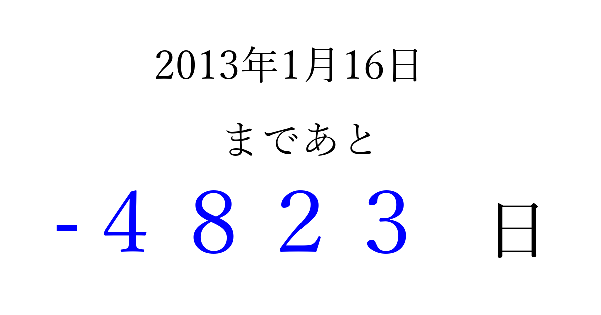 2013年1月16日(水)は もう 0000 日過ぎました 追加すると、トップページからすぐ選べるようになります ※2026/04/01現在の結果です。 最新の状態に更新する ↓シェアして、タイムライン上にカウントダウンを表示しよう!↓ 📤 この結果を共有する Tweet シェア Threads Bluesky 別の日付でカウントダウン 2013年1月のカレンダー このページをブックマークに追加すると、いつでもカウントダウンを確認できます。 (PC: Ctrl+D / Mac: ⌘+D) hitome-notes.comでは以下のページも運営しています。 指定日と期間から日付を計算 | ガチャ確率計算・シミュレーション | プライバシー・ポリシー 運営者:Avocado