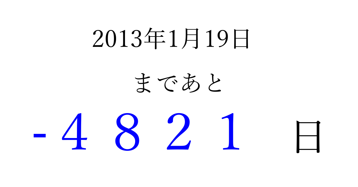 2013年1月19日(土)は もう 0000 日過ぎました 追加すると、トップページからすぐ選べるようになります ※2026/04/02現在の結果です。 最新の状態に更新する ↓シェアして、タイムライン上にカウントダウンを表示しよう!↓ 📤 この結果を共有する Tweet シェア Threads Bluesky 別の日付でカウントダウン 2013年1月のカレンダー このページをブックマークに追加すると、いつでもカウントダウンを確認できます。 (PC: Ctrl+D / Mac: ⌘+D) hitome-notes.comでは以下のページも運営しています。 指定日と期間から日付を計算 | ガチャ確率計算・シミュレーション | プライバシー・ポリシー 運営者:Avocado