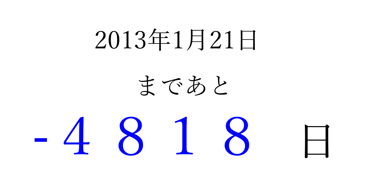 2013年1月21日(月)は もう 0000 日過ぎました 追加すると、トップページからすぐ選べるようになります ※2026/04/01現在の結果です。 最新の状態に更新する ↓シェアして、タイムライン上にカウントダウンを表示しよう!↓ 📤 この結果を共有する Tweet シェア Threads Bluesky 別の日付でカウントダウン 2013年1月のカレンダー このページをブックマークに追加すると、いつでもカウントダウンを確認できます。 (PC: Ctrl+D / Mac: ⌘+D) hitome-notes.comでは以下のページも運営しています。 指定日と期間から日付を計算 | ガチャ確率計算・シミュレーション | プライバシー・ポリシー 運営者:Avocado