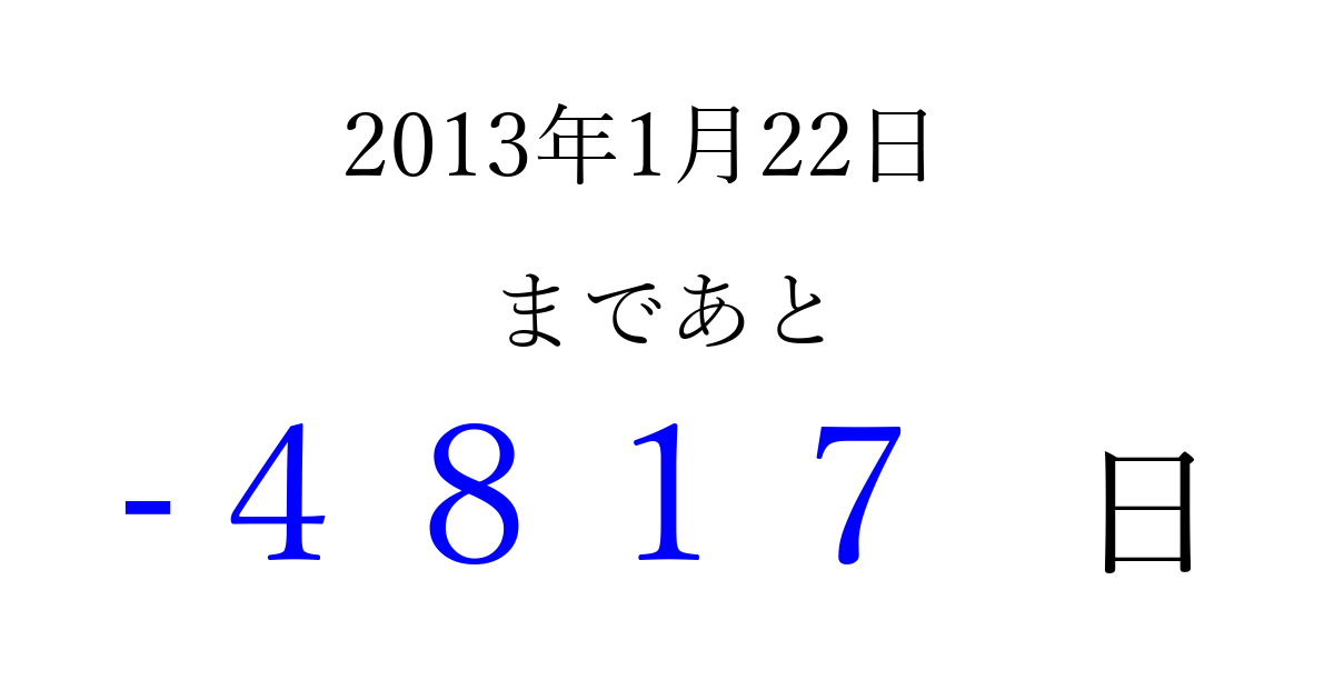 2013年1月22日(火)は もう 0000 日過ぎました 追加すると、トップページからすぐ選べるようになります ※2026/04/01現在の結果です。 最新の状態に更新する ↓シェアして、タイムライン上にカウントダウンを表示しよう!↓ 📤 この結果を共有する Tweet シェア Threads Bluesky 別の日付でカウントダウン 2013年1月のカレンダー このページをブックマークに追加すると、いつでもカウントダウンを確認できます。 (PC: Ctrl+D / Mac: ⌘+D) hitome-notes.comでは以下のページも運営しています。 指定日と期間から日付を計算 | ガチャ確率計算・シミュレーション | プライバシー・ポリシー 運営者:Avocado