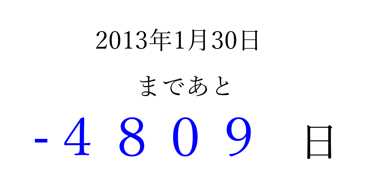 2013年1月30日(水)は もう 0000 日過ぎました 追加すると、トップページからすぐ選べるようになります ※2026/04/01現在の結果です。 最新の状態に更新する ↓シェアして、タイムライン上にカウントダウンを表示しよう!↓ 📤 この結果を共有する Tweet シェア Threads Bluesky 別の日付でカウントダウン 2013年1月のカレンダー このページをブックマークに追加すると、いつでもカウントダウンを確認できます。 (PC: Ctrl+D / Mac: ⌘+D) hitome-notes.comでは以下のページも運営しています。 指定日と期間から日付を計算 | ガチャ確率計算・シミュレーション | プライバシー・ポリシー 運営者:Avocado