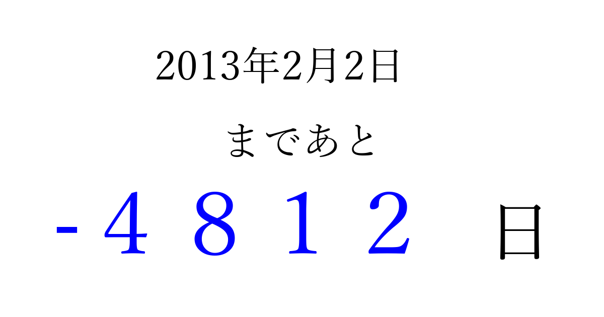 2013年2月2日(土)は もう 0000 日過ぎました 追加すると、トップページからすぐ選べるようになります ※2026/04/07現在の結果です。 最新の状態に更新する ↓シェアして、タイムライン上にカウントダウンを表示しよう!↓ 📤 この結果を共有する Tweet シェア Threads Bluesky 別の日付でカウントダウン 2013年2月のカレンダー このページをブックマークに追加すると、いつでもカウントダウンを確認できます。 (PC: Ctrl+D / Mac: ⌘+D) hitome-notes.comでは以下のページも運営しています。 指定日と期間から日付を計算 | ガチャ確率計算・シミュレーション | プライバシー・ポリシー 運営者:Avocado