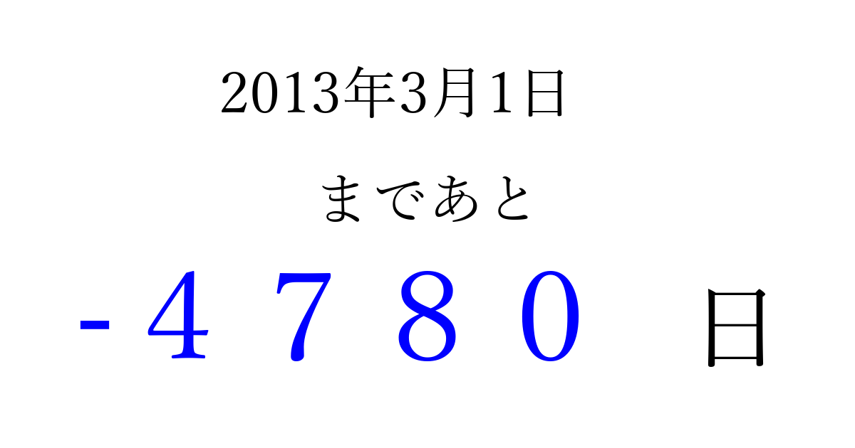 2013年3月1日(金)は もう 0000 日過ぎました 追加すると、トップページからすぐ選べるようになります ※2026/04/02現在の結果です。 最新の状態に更新する ↓シェアして、タイムライン上にカウントダウンを表示しよう!↓ 📤 この結果を共有する Tweet シェア Threads Bluesky 別の日付でカウントダウン 2013年3月のカレンダー このページをブックマークに追加すると、いつでもカウントダウンを確認できます。 (PC: Ctrl+D / Mac: ⌘+D) hitome-notes.comでは以下のページも運営しています。 指定日と期間から日付を計算 | ガチャ確率計算・シミュレーション | プライバシー・ポリシー 運営者:Avocado