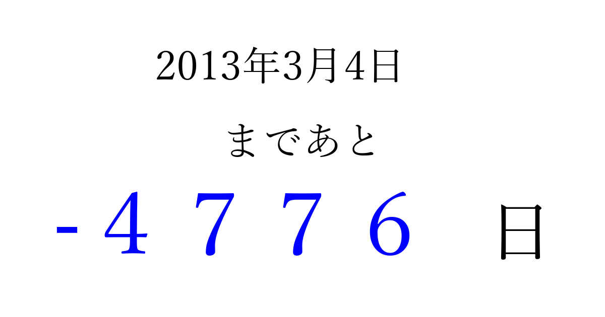 2013年3月4日(月)は もう 0000 日過ぎました 追加すると、トップページからすぐ選べるようになります ※2026/04/01現在の結果です。 最新の状態に更新する ↓シェアして、タイムライン上にカウントダウンを表示しよう!↓ 📤 この結果を共有する Tweet シェア Threads Bluesky 別の日付でカウントダウン 2013年3月のカレンダー このページをブックマークに追加すると、いつでもカウントダウンを確認できます。 (PC: Ctrl+D / Mac: ⌘+D) hitome-notes.comでは以下のページも運営しています。 指定日と期間から日付を計算 | ガチャ確率計算・シミュレーション | プライバシー・ポリシー 運営者:Avocado