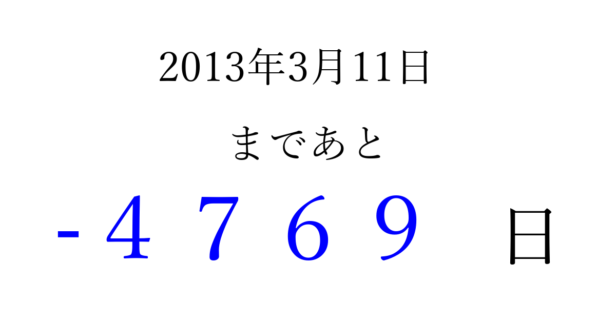 2013年3月11日(月)は もう 0000 日過ぎました 追加すると、トップページからすぐ選べるようになります ※2026/04/01現在の結果です。 最新の状態に更新する ↓シェアして、タイムライン上にカウントダウンを表示しよう!↓ 📤 この結果を共有する Tweet シェア Threads Bluesky 別の日付でカウントダウン 2013年3月のカレンダー このページをブックマークに追加すると、いつでもカウントダウンを確認できます。 (PC: Ctrl+D / Mac: ⌘+D) hitome-notes.comでは以下のページも運営しています。 指定日と期間から日付を計算 | ガチャ確率計算・シミュレーション | プライバシー・ポリシー 運営者:Avocado