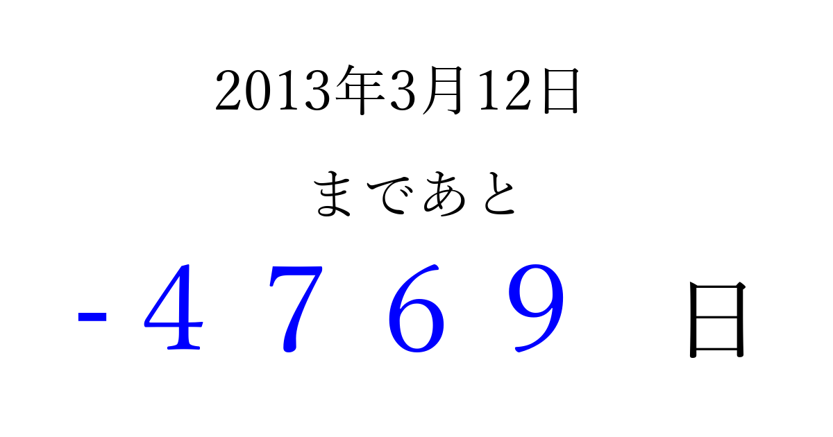 2013年3月12日(火)は もう 0000 日過ぎました 追加すると、トップページからすぐ選べるようになります ※2026/04/02現在の結果です。 最新の状態に更新する ↓シェアして、タイムライン上にカウントダウンを表示しよう!↓ 📤 この結果を共有する Tweet シェア Threads Bluesky 別の日付でカウントダウン 2013年3月のカレンダー このページをブックマークに追加すると、いつでもカウントダウンを確認できます。 (PC: Ctrl+D / Mac: ⌘+D) hitome-notes.comでは以下のページも運営しています。 指定日と期間から日付を計算 | ガチャ確率計算・シミュレーション | プライバシー・ポリシー 運営者:Avocado