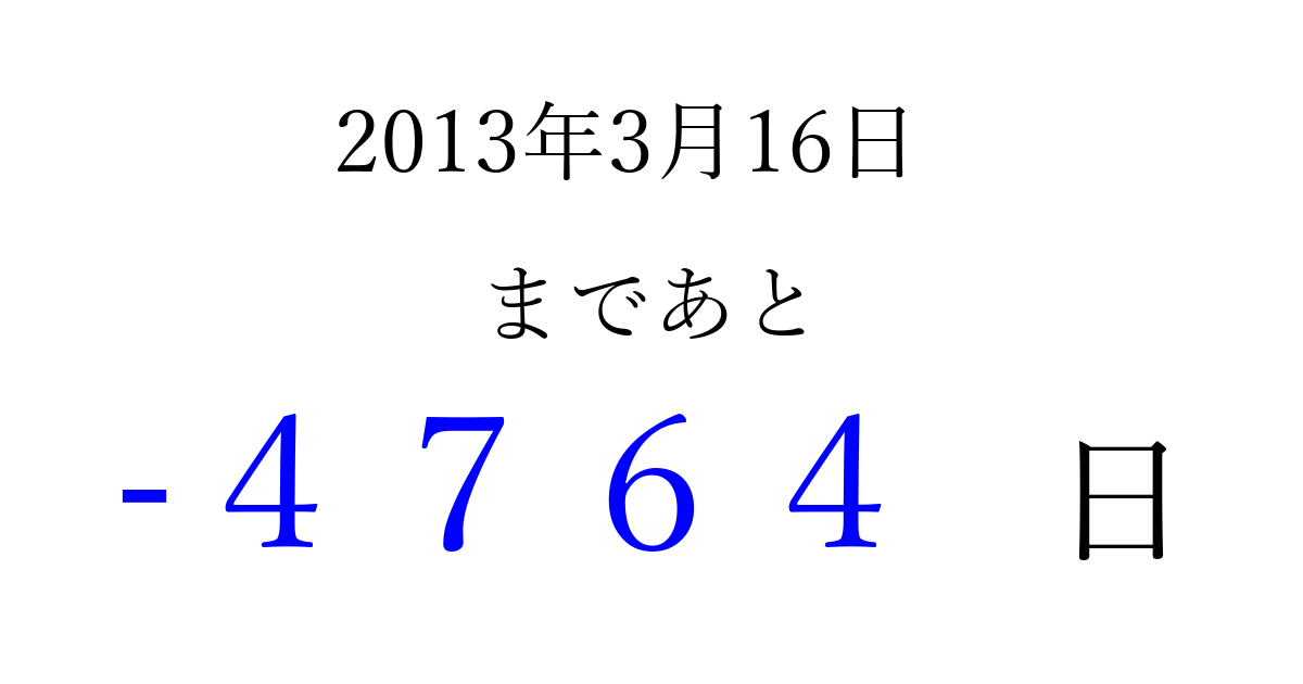 2013年3月16日(土)は もう 0000 日過ぎました 追加すると、トップページからすぐ選べるようになります ※2026/04/01現在の結果です。 最新の状態に更新する ↓シェアして、タイムライン上にカウントダウンを表示しよう!↓ 📤 この結果を共有する Tweet シェア Threads Bluesky 別の日付でカウントダウン 2013年3月のカレンダー このページをブックマークに追加すると、いつでもカウントダウンを確認できます。 (PC: Ctrl+D / Mac: ⌘+D) hitome-notes.comでは以下のページも運営しています。 指定日と期間から日付を計算 | ガチャ確率計算・シミュレーション | プライバシー・ポリシー 運営者:Avocado