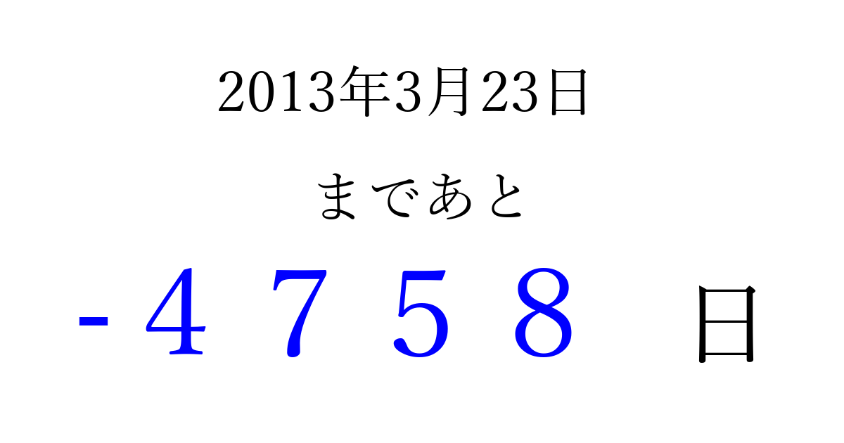 2013年3月23日(土)は もう 0000 日過ぎました 追加すると、トップページからすぐ選べるようになります ※2026/04/02現在の結果です。 最新の状態に更新する ↓シェアして、タイムライン上にカウントダウンを表示しよう!↓ 📤 この結果を共有する Tweet シェア Threads Bluesky 別の日付でカウントダウン 2013年3月のカレンダー このページをブックマークに追加すると、いつでもカウントダウンを確認できます。 (PC: Ctrl+D / Mac: ⌘+D) hitome-notes.comでは以下のページも運営しています。 指定日と期間から日付を計算 | ガチャ確率計算・シミュレーション | プライバシー・ポリシー 運営者:Avocado