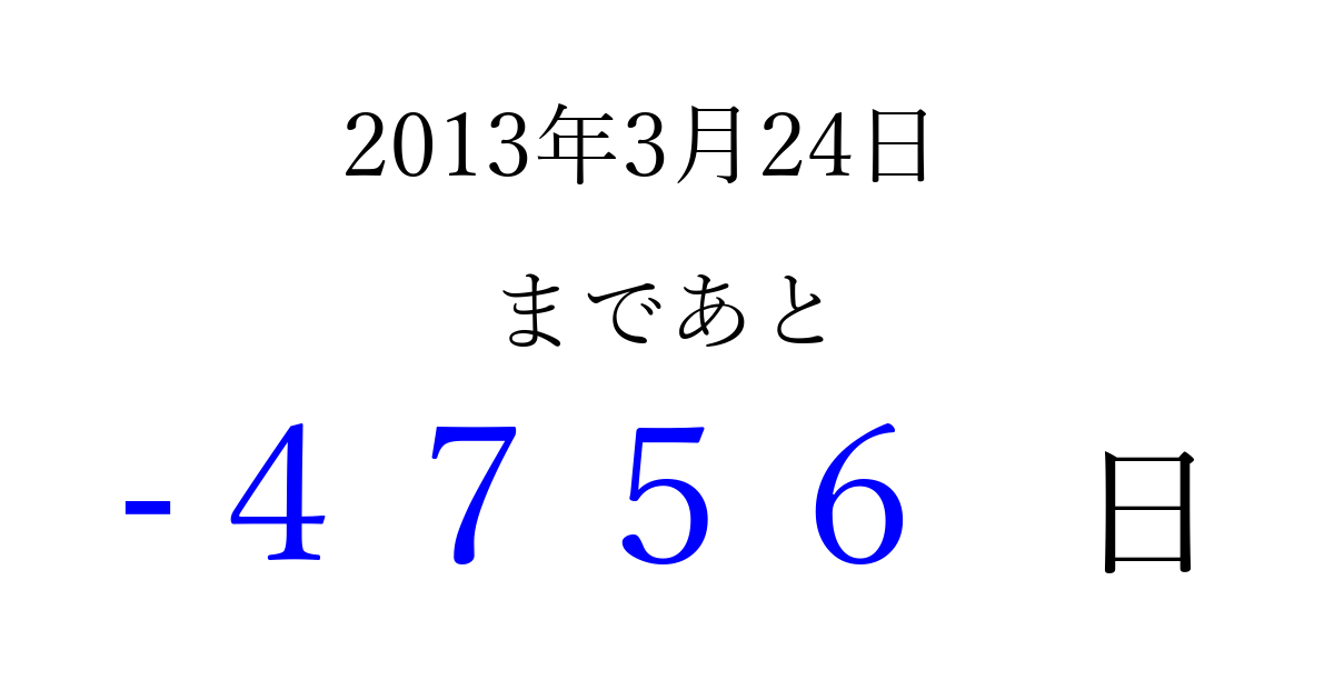 2013年3月24日(日)は もう 0000 日過ぎました 追加すると、トップページからすぐ選べるようになります ※2026/04/01現在の結果です。 最新の状態に更新する ↓シェアして、タイムライン上にカウントダウンを表示しよう!↓ 📤 この結果を共有する Tweet シェア Threads Bluesky 別の日付でカウントダウン 2013年3月のカレンダー このページをブックマークに追加すると、いつでもカウントダウンを確認できます。 (PC: Ctrl+D / Mac: ⌘+D) hitome-notes.comでは以下のページも運営しています。 指定日と期間から日付を計算 | ガチャ確率計算・シミュレーション | プライバシー・ポリシー 運営者:Avocado