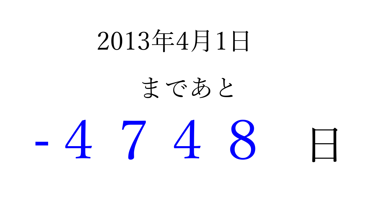 2013年4月1日(月)は もう 0000 日過ぎました 追加すると、トップページからすぐ選べるようになります ※2026/04/01現在の結果です。 最新の状態に更新する ↓シェアして、タイムライン上にカウントダウンを表示しよう!↓ 📤 この結果を共有する Tweet シェア Threads Bluesky 別の日付でカウントダウン 2013年4月のカレンダー このページをブックマークに追加すると、いつでもカウントダウンを確認できます。 (PC: Ctrl+D / Mac: ⌘+D) hitome-notes.comでは以下のページも運営しています。 指定日と期間から日付を計算 | ガチャ確率計算・シミュレーション | プライバシー・ポリシー 運営者:Avocado