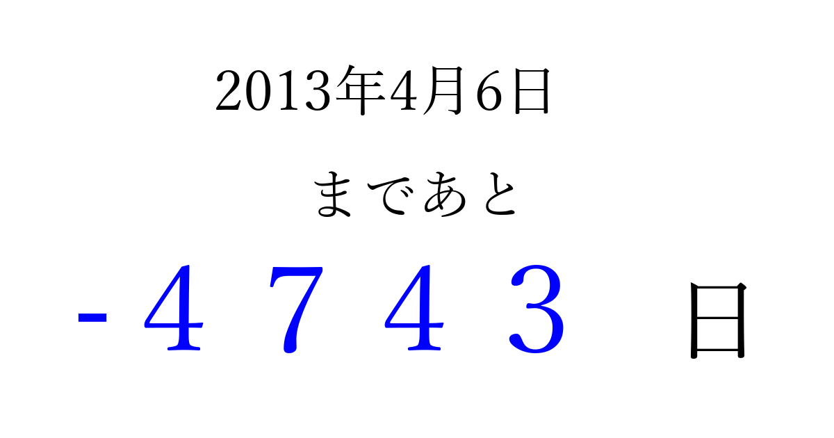 2013年4月6日(土)は もう 0000 日過ぎました 追加すると、トップページからすぐ選べるようになります ※2026/04/01現在の結果です。 最新の状態に更新する ↓シェアして、タイムライン上にカウントダウンを表示しよう!↓ 📤 この結果を共有する Tweet シェア Threads Bluesky 別の日付でカウントダウン 2013年4月のカレンダー このページをブックマークに追加すると、いつでもカウントダウンを確認できます。 (PC: Ctrl+D / Mac: ⌘+D) hitome-notes.comでは以下のページも運営しています。 指定日と期間から日付を計算 | ガチャ確率計算・シミュレーション | プライバシー・ポリシー 運営者:Avocado