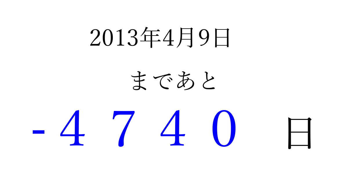 2013年4月9日(火)は もう 0000 日過ぎました 追加すると、トップページからすぐ選べるようになります ※2026/04/01現在の結果です。 最新の状態に更新する ↓シェアして、タイムライン上にカウントダウンを表示しよう!↓ 📤 この結果を共有する Tweet シェア Threads Bluesky 別の日付でカウントダウン 2013年4月のカレンダー このページをブックマークに追加すると、いつでもカウントダウンを確認できます。 (PC: Ctrl+D / Mac: ⌘+D) hitome-notes.comでは以下のページも運営しています。 指定日と期間から日付を計算 | ガチャ確率計算・シミュレーション | プライバシー・ポリシー 運営者:Avocado