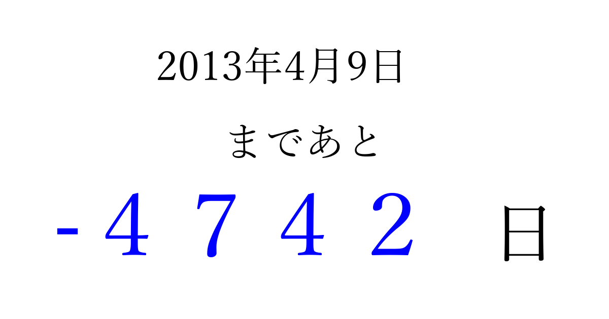 2013年4月9日(火)は もう 0000 日過ぎました 追加すると、トップページからすぐ選べるようになります ※2026/04/03現在の結果です。 最新の状態に更新する ↓シェアして、タイムライン上にカウントダウンを表示しよう!↓ 📤 この結果を共有する Tweet シェア Threads Bluesky 別の日付でカウントダウン 2013年4月のカレンダー このページをブックマークに追加すると、いつでもカウントダウンを確認できます。 (PC: Ctrl+D / Mac: ⌘+D) hitome-notes.comでは以下のページも運営しています。 指定日と期間から日付を計算 | ガチャ確率計算・シミュレーション | プライバシー・ポリシー 運営者:Avocado