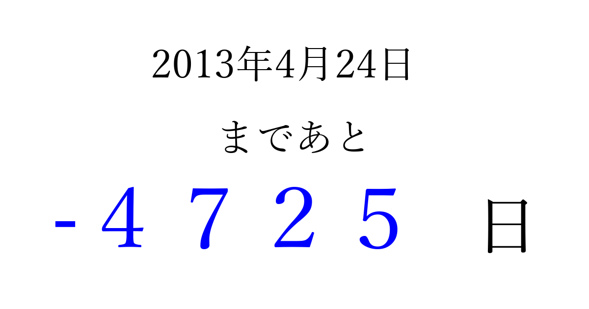 2013年4月24日(水)は もう 0000 日過ぎました 追加すると、トップページからすぐ選べるようになります ※2026/04/01現在の結果です。 最新の状態に更新する ↓シェアして、タイムライン上にカウントダウンを表示しよう!↓ 📤 この結果を共有する Tweet シェア Threads Bluesky 別の日付でカウントダウン 2013年4月のカレンダー このページをブックマークに追加すると、いつでもカウントダウンを確認できます。 (PC: Ctrl+D / Mac: ⌘+D) hitome-notes.comでは以下のページも運営しています。 指定日と期間から日付を計算 | ガチャ確率計算・シミュレーション | プライバシー・ポリシー 運営者:Avocado