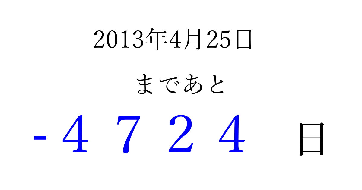 2013年4月25日(木)は もう 0000 日過ぎました 追加すると、トップページからすぐ選べるようになります ※2026/04/01現在の結果です。 最新の状態に更新する ↓シェアして、タイムライン上にカウントダウンを表示しよう!↓ 📤 この結果を共有する Tweet シェア Threads Bluesky 別の日付でカウントダウン 2013年4月のカレンダー このページをブックマークに追加すると、いつでもカウントダウンを確認できます。 (PC: Ctrl+D / Mac: ⌘+D) hitome-notes.comでは以下のページも運営しています。 指定日と期間から日付を計算 | ガチャ確率計算・シミュレーション | プライバシー・ポリシー 運営者:Avocado
