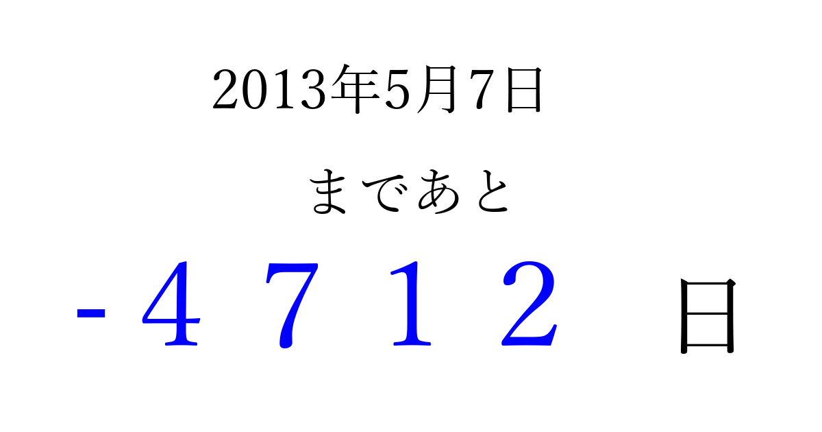 2013年5月7日(火)は もう 0000 日過ぎました 追加すると、トップページからすぐ選べるようになります ※2026/04/01現在の結果です。 最新の状態に更新する ↓シェアして、タイムライン上にカウントダウンを表示しよう!↓ 📤 この結果を共有する Tweet シェア Threads Bluesky 別の日付でカウントダウン 2013年5月のカレンダー このページをブックマークに追加すると、いつでもカウントダウンを確認できます。 (PC: Ctrl+D / Mac: ⌘+D) hitome-notes.comでは以下のページも運営しています。 指定日と期間から日付を計算 | ガチャ確率計算・シミュレーション | プライバシー・ポリシー 運営者:Avocado