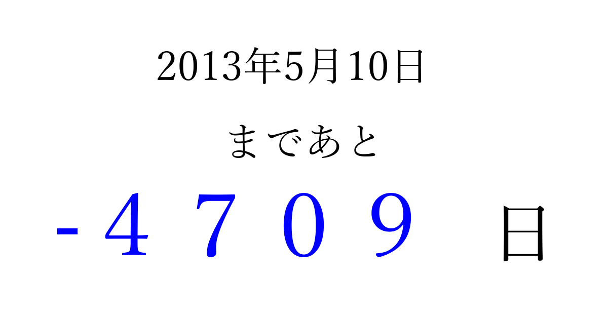 2013年5月10日(金)は もう 0000 日過ぎました 追加すると、トップページからすぐ選べるようになります ※2026/04/01現在の結果です。 最新の状態に更新する ↓シェアして、タイムライン上にカウントダウンを表示しよう!↓ 📤 この結果を共有する Tweet シェア Threads Bluesky 別の日付でカウントダウン 2013年5月のカレンダー このページをブックマークに追加すると、いつでもカウントダウンを確認できます。 (PC: Ctrl+D / Mac: ⌘+D) hitome-notes.comでは以下のページも運営しています。 指定日と期間から日付を計算 | ガチャ確率計算・シミュレーション | プライバシー・ポリシー 運営者:Avocado